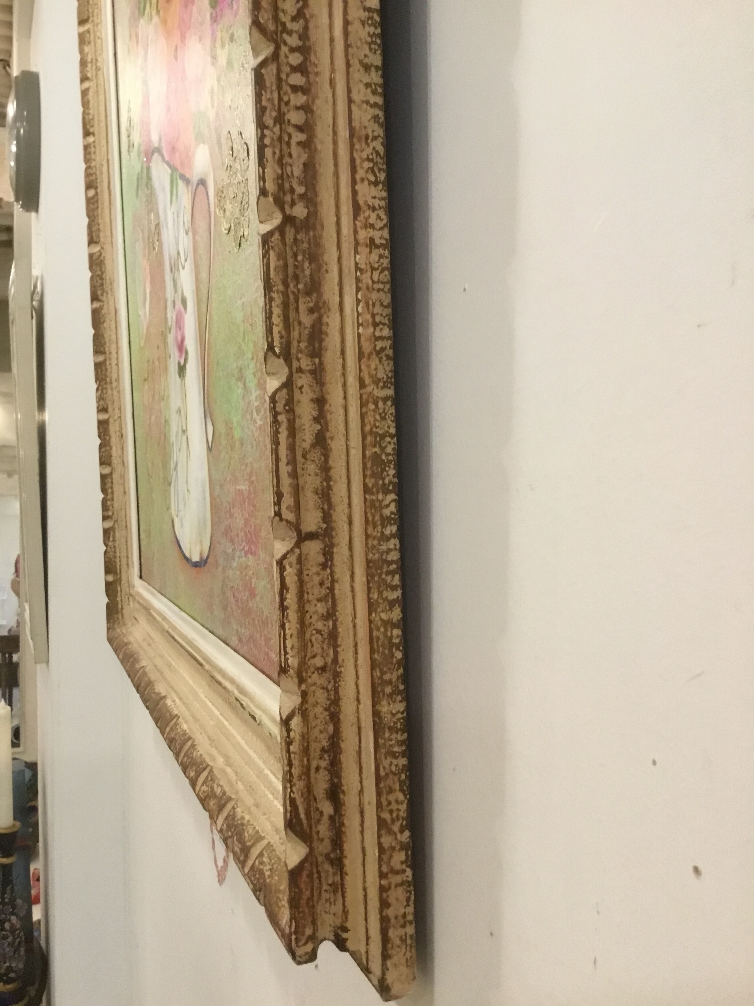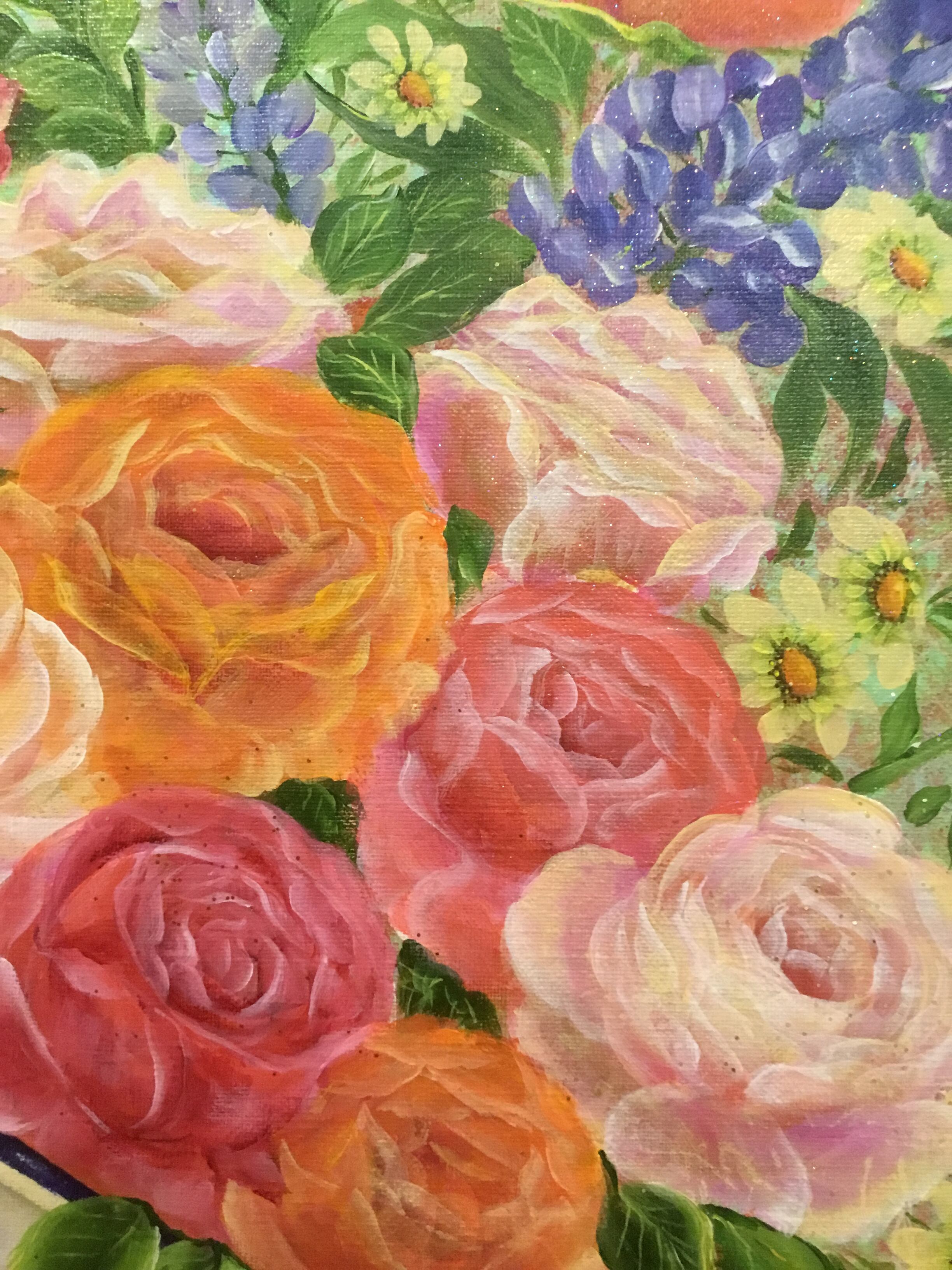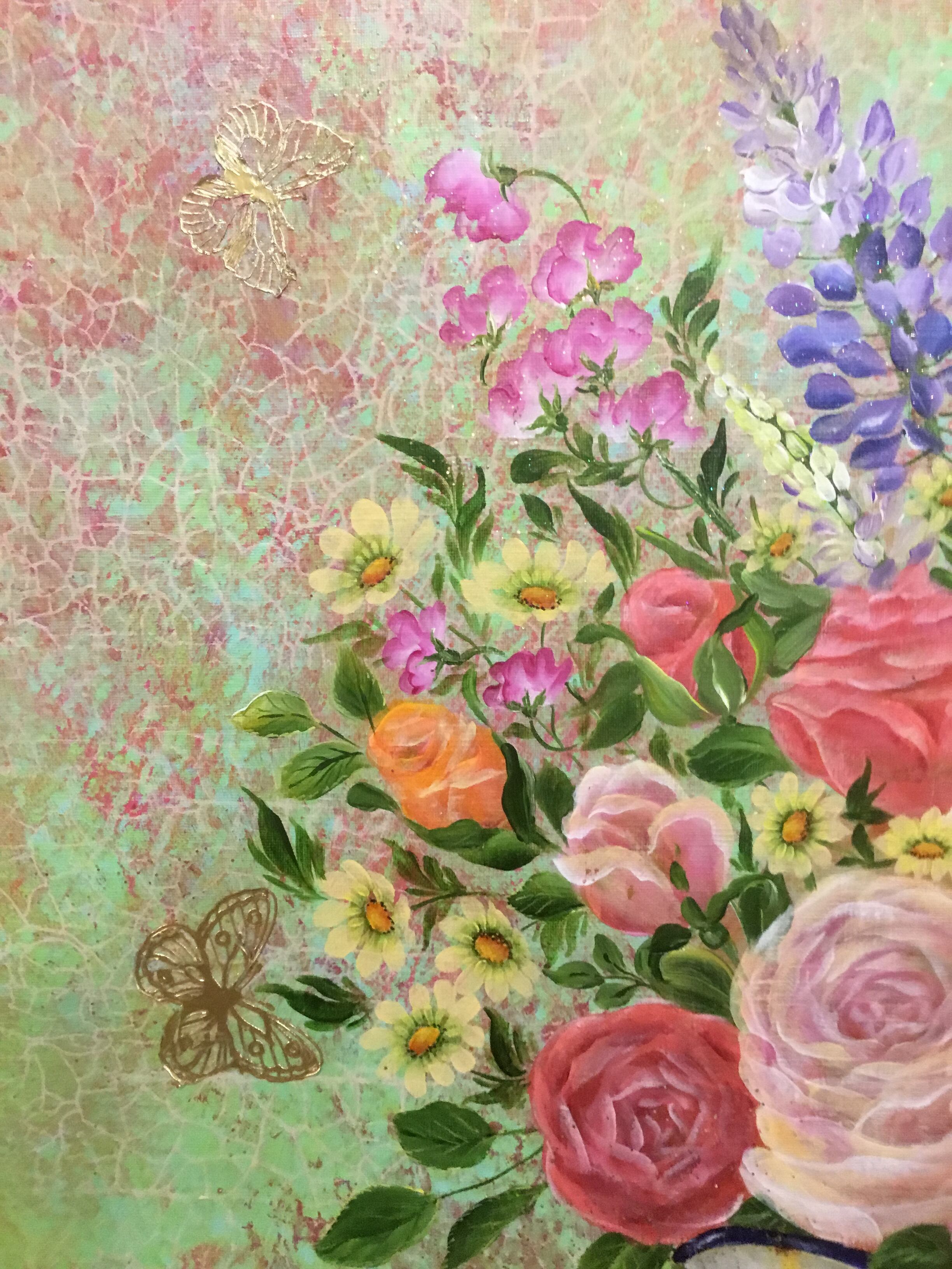 お部屋にいつも、いけたお花があったらいいな、との思いからこの絵は生まれました。いつも優しく母、父のような大きな無償の愛情を放ち見守って励ましてくれる家族の様な大切な絵だと感じてもらえます。