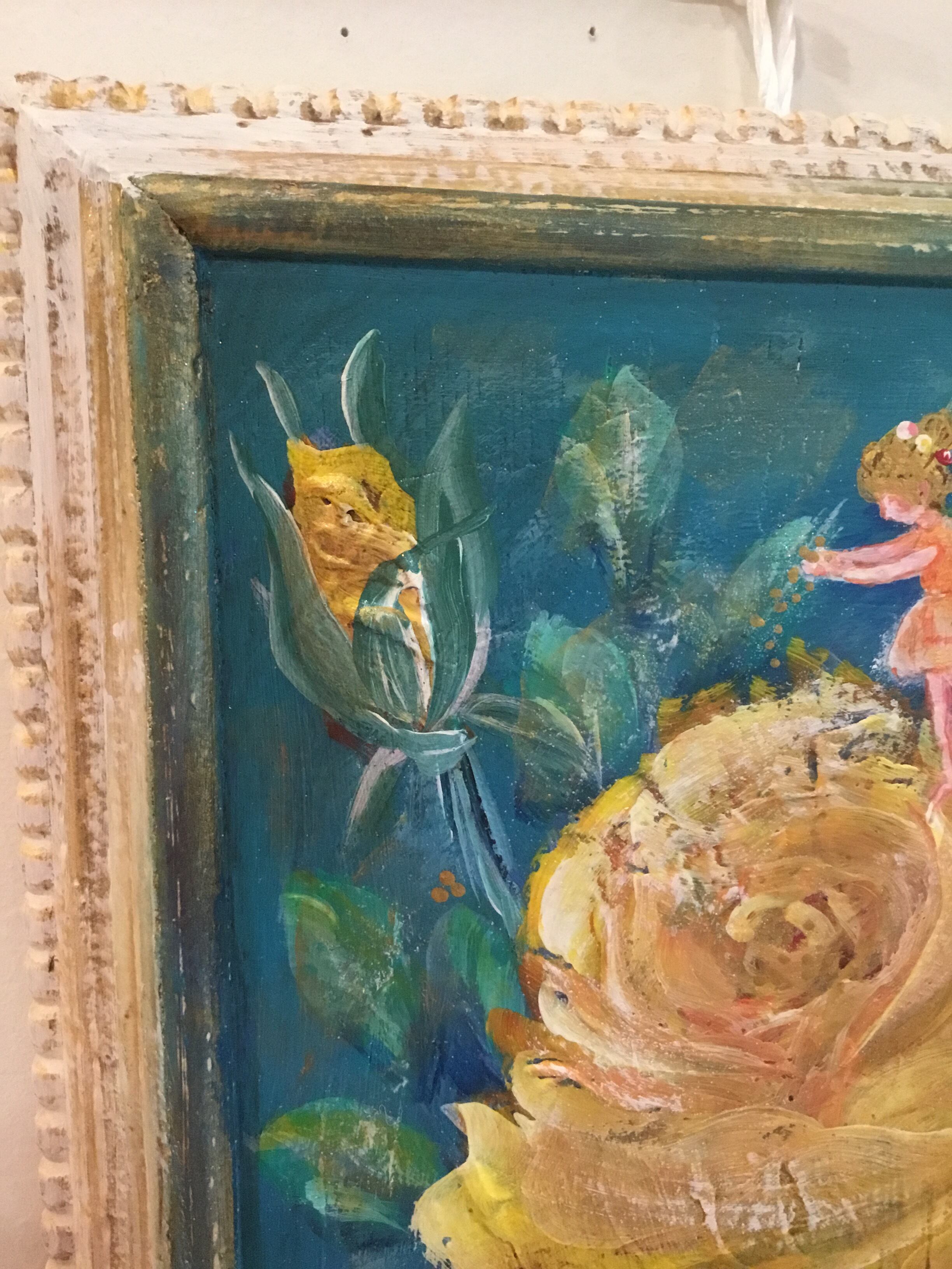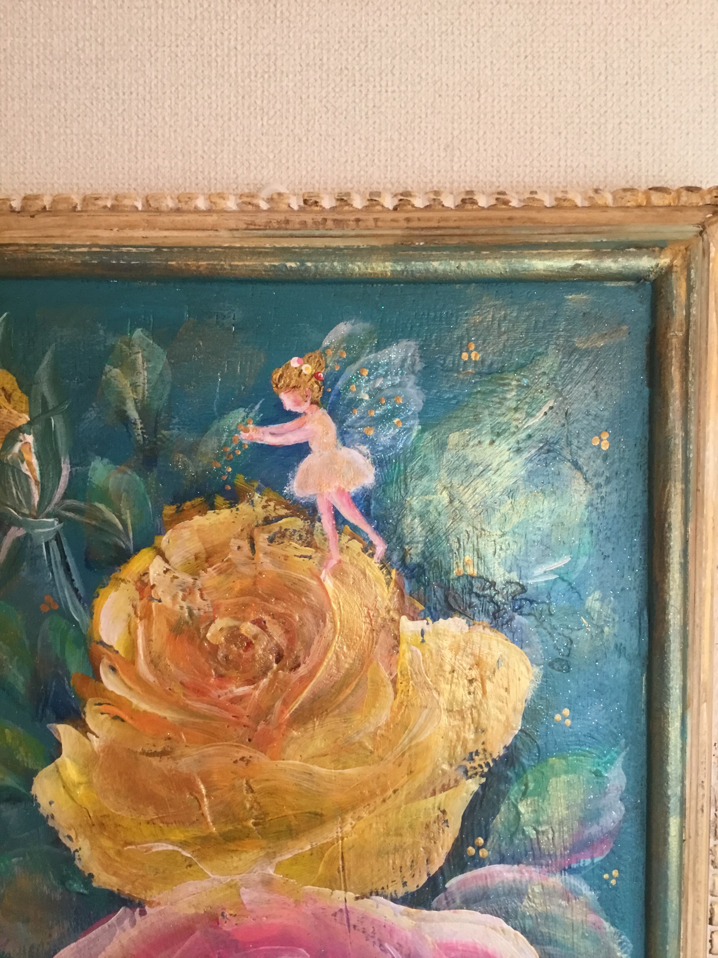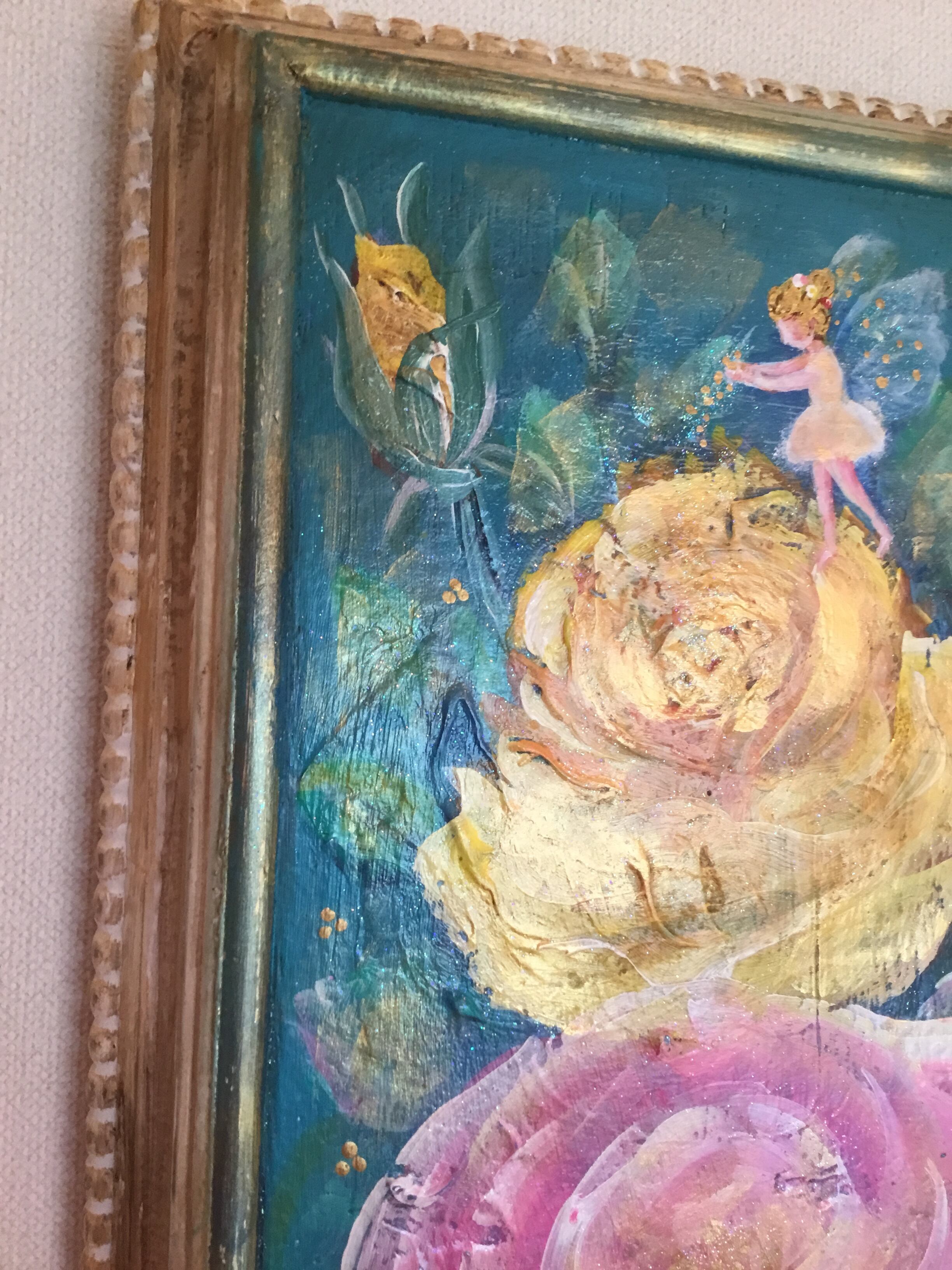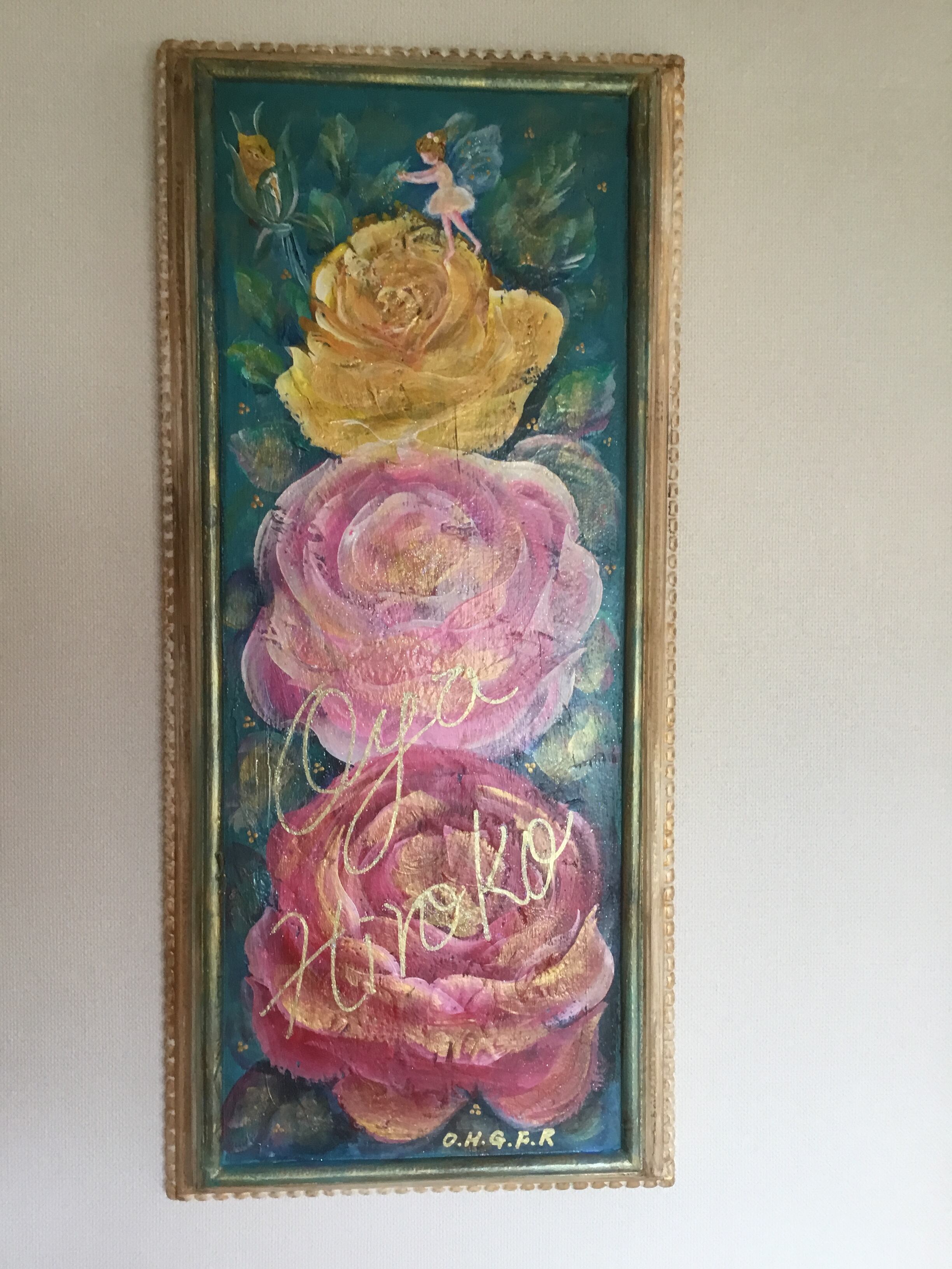 大宅広子のウェディングプレゼント「アンティーク加工 薔薇と妖精の子宝絵 トリプルローズプラスワン」原画
